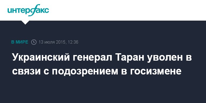 "Генерал Таран уволен с должности руководителя украинской стороны СЦКК. Ему объявлено подозрение по ст. 111 УК Украины (государственная измена)", - сообщается в микроблоге СНБО в Твиттере.