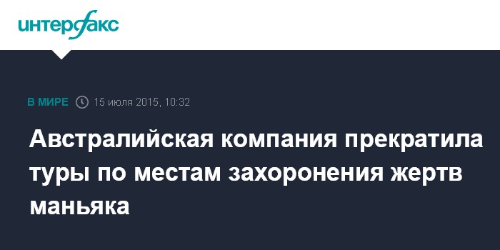 Москва. 15 июля. INTERFAX.RU - Австралийская туристическая компания из-за сильной критики прекратила "призрачные туры" по лесу, где серийный убийца хоронил своих жертв. Об этом сообщает "Би-би-си".
