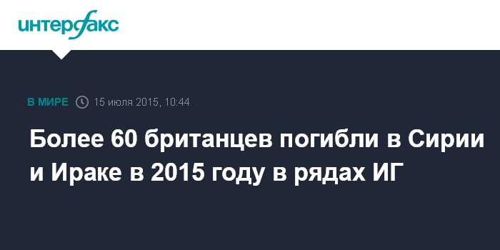 Москва. 15 июля. INTERFAX.RU - Свыше 60 подданных Великобритании погибли в этом году в Сирии и Ираке, сражаясь в рядах экстремистской группировки "Исламское государство" (ИГ), сообщает в среду британская газета The Daily Telegraph.
