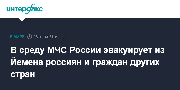 Москва. 15 июля. INTERFAX.RU - МЧС эвакуирует из Йемена граждан РФ, стран СНГ и других государств, пожелавших покинуть зону вооруженного конфликта, сообщил "Интерфаксу" замдиректора департамента международной деятельности министерства Александр Томашов.