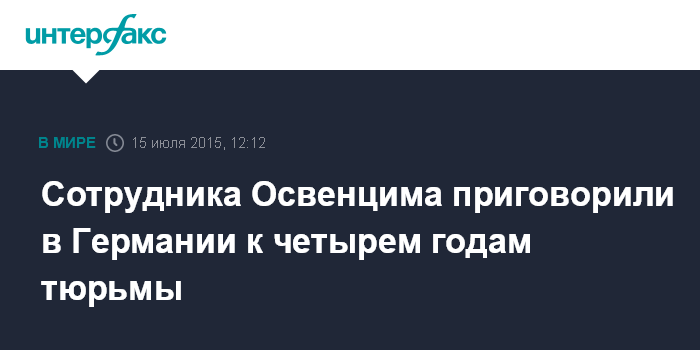 Москва. 15 июля. INTERFAX.RU - Суд в Германии приговорил служившего в концлагере Освенцим бывшего эсэсовца 94-летнего Оскара Гренинга (Oskar Gröning) к четырем годам тюремного заключения, сообщает в среду агентство Associated Press.