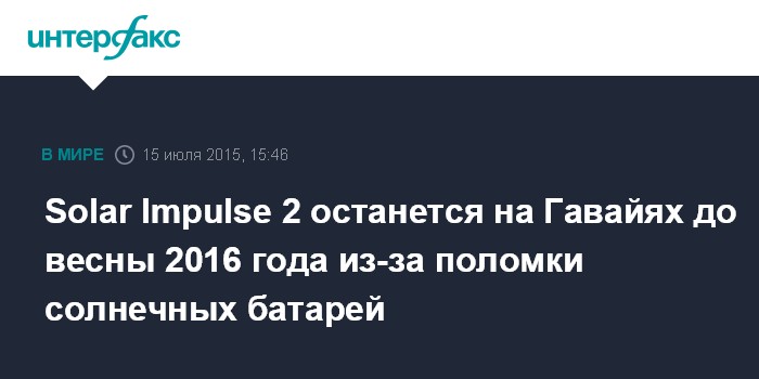 "Батареи повредились из-за перегрева. Несмотря на усердную работу, повреждения отдельных частей батареи серьезны и потребуют починки, которая займет недели. В итоге мы останемся на Гавайях до весны 2016 года", - написал швейцарский пилот Андре Боршберг в твиттере.