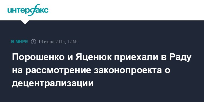 Москва. 16 июля. INTERFAX.RU - Верховная рада Украины приступила к рассмотрению внесенного президентом Петром Порошенко проекта закона о внесении изменений в Конституцию страны относительно децентрализации власти, предусматривающего закрепление в тексте основного закона положений об особенностях местного самоуправления в отдельных районах Донбасса.