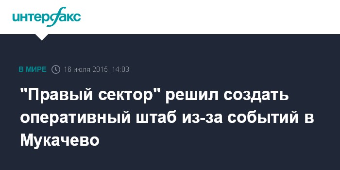 Москва. 16 июля. INTERFAX.RU - Руководство движения "Правый сектор" (запрещенная в РФ организация - ИФ) заявляет о намерении создания временного оперативного штаба из-за ситуации в городе Мукачево (Закарпатская область).