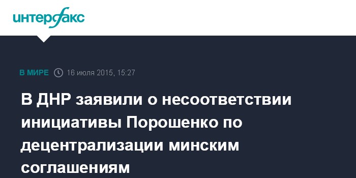 Москва. 16 июля. INTERFAX.RU - В самопровозглашенной Донецкой народной республике полагают, что поправки президента Украины Петра Порошенко в Конституцию, которые украинские депутаты отправили в четверг в КС, не отвечают минским соглашениям.