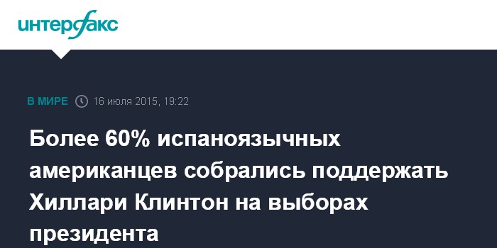 Москва. 16 июля. INTERFAX.RU - Шесть из десяти испаноговорящих жителей США видят следующим президентом этой страны Хиллари Клинтон, свидетельствуют данные опроса, распространенные в четверг телеканалом Univision.