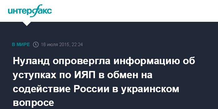 Москва. 16 июля. INTERFAX.RU - США не договаривались с РФ об уступках на украинском направлении в обмен на содействие Москвы в урегулировании по иранской ядерной программе, заявила заместитель госсекретаря США Виктория Нуланд.