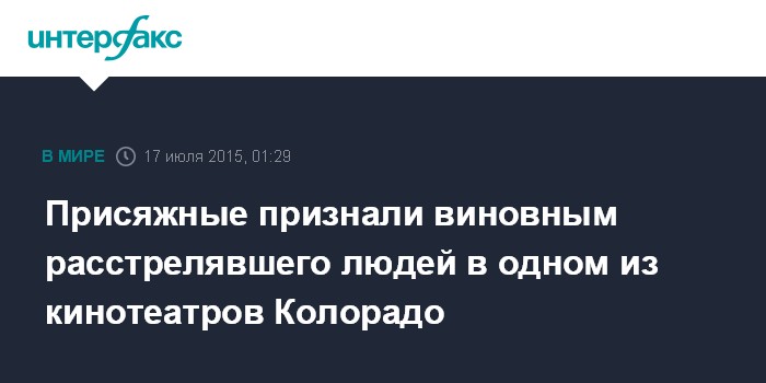Москва. 17 июля. INTERFAX.RU - Суд присяжных признал виновным в убийствах Джеймса Холмса, расстрелявшего 12 человек на премьере фильма "Темный рыцарь: Возрождение легенды" в одном из кинотеатров города Орора, штат Колорадо, сообщило в пятницу агентство Associated Press.
