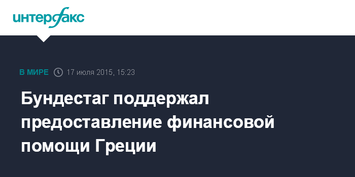 Москва. 17 июля. INTERFAX.RU - Депутаты федерального парламента Германии в пятницу высказались в поддержку идеи предоставления Греции третьего пакета финансовой помощи от ЕС и МВФ, сообщают западные СМИ.
