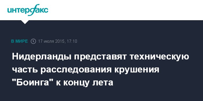 Москва. 17 июля. INTERFAX.RU - Нидерланды к концу лета представят выводы технической комиссии, расследующей причины крушения малайзийского "Боинга" МН-17 в Донбассе, сообщил вице-премьер Украины Геннадий Зубко.