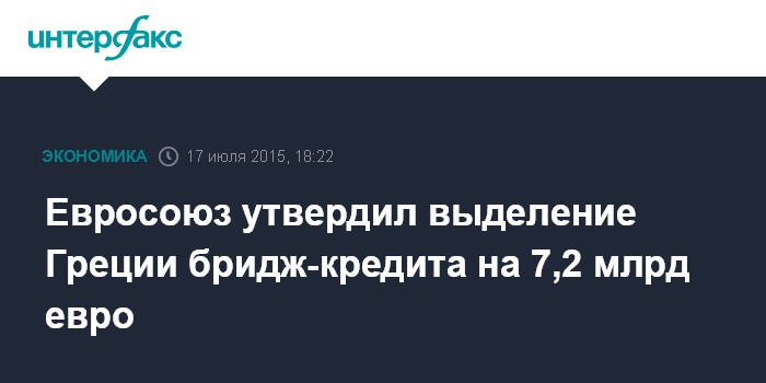 Москва. 17 июля. INTERFAX.RU - Евросоюз утвердил выделение Греции бридж-кредита в размере 7,2 млрд евро, который поможет стране избежать дефолта по предстоящим платежам и дотянуть до выделения ей третьего пакета финансовой помощи, сообщает агентство Bloomberg.