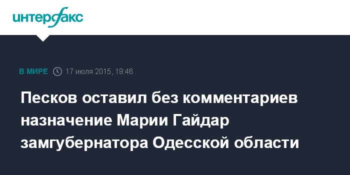 Москва. 17 июля. INTERFAX.RU - В Кремле не комментируют представление Марии Гайдар на должность вице-губернатора Одесской области Украины.