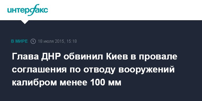Москва. 18 июля. INTERFAX.RU - Соглашение по отводу вооружений калибром менее 100 мм на линии противостояния в Донбассе не удалось подписать в ходе переговоров в Минске из-за отказа Украины, заявил в субботу глава самопровозглашенной Донецкой народной республики Александр Захарченко.