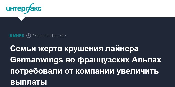 Москва. 18 июля. INTERFAX.RU - Родственники жертв крушения лайнера Germanwings во французских Альпах отклонили предложение авиакомпании о выплате денежных компенсациях, так как сочли их недостаточными, сообщает BBC.