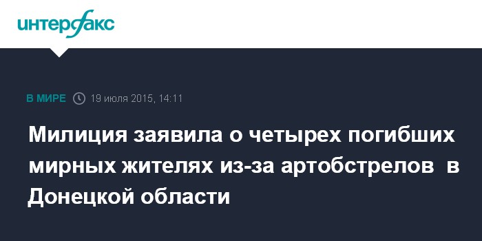Москва. 19 июля. INTERFAX.RU - Главное управление МВД Украины по Донецкой области сообщило о четверых мирных жителях, погибших за сутки в результате артобстрелов в Донбассе. При этом вина за артобстрелы возлагается на вооруженных противников киевских властей.