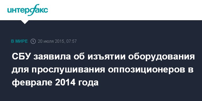 Москва. 20 июля. INTERFAX.RU - Служба безопасности Украины 18 июля изъяла комплекс оборудования, которое незаконно использовалось для прослушивания телефонных разговоров оппозиционных лидеров и активистов во время так называемой Революции Достоинства в феврале 2014 года.