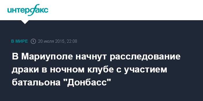 Москва. 20 июля. INTERFAX.RU - По факту драки в мариупольском ночном клубе, которая произошла в минувшее воскресенье, милиция открыла уголовное производство в отношении обеих сторон конфликта - бойцов батальона "Донбасс" и охранников заведения, сообщает пресс-служба ГУ МВД в Донецкой области.