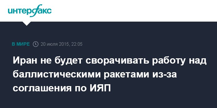 Москва. 20 июля. INTERFAX.RU - Резолюция СБ ООН в поддержку соглашения, заключенного по атому Ираном и "шестеркой", никак не затрагивает иранскую программу по созданию баллистических ракет, заявили в понедельник в МИД Ирана.