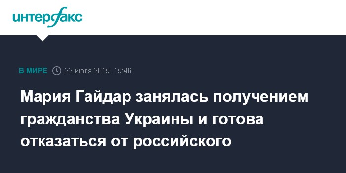 Москва. 22 июля. INTERFAX.RU - Российский оппозиционный общественный деятель Мария Гайдар, уехавшая на Украину, чтобы занять пост заместителя главы Одесской области Михаила Саакашвили, находится в процессе получения украинского гражданства.