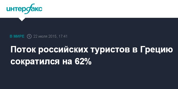 Москва. 22 июля. INTERFAX.RU - Туристический поток россиян в Грецию упал за первые пять месяцев 2015 года на 62% по сравнению с тем же периодом прошлого года - до 56 тыс. человек, говорится в сообщении Банка Греции в среду .