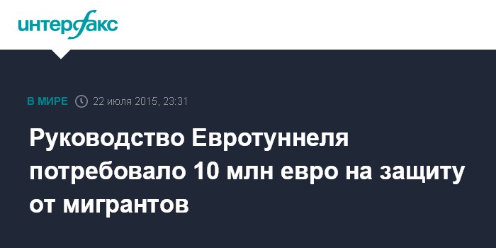 Москва. 22 июля. INTERFAX.RU - Оператор туннеля Eurotunnel, соединяющего Европу и Великобританию, требует десять млн евро (семь млн фунтов стерлингов) в качестве компенсации от правительств Франции и Великрбритании за расходы на обеспечение безопасности от наплыва мигрантов. Об этом сообщает Guardian.