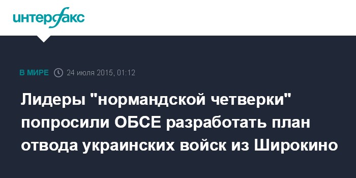 Москва. 24 июля. INTERFAX.RU - Лидеры стран "нормандской четверки" в ходе телефонного разговора решили попросить ОБСЕ до 3 августа разработать варианты для вывода украинских военных из Широкино, говорится в коммюнике Елисейского дворца.
