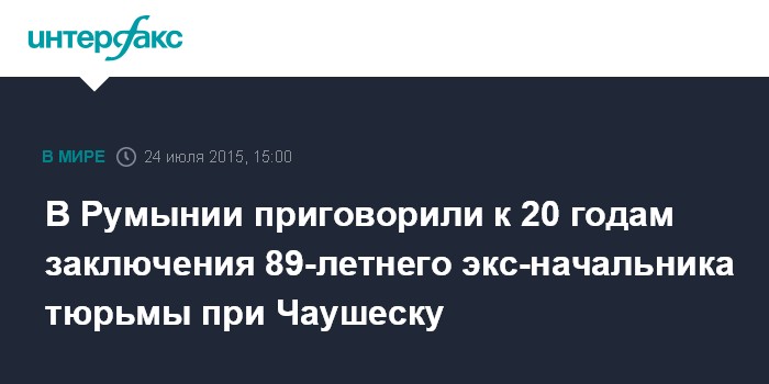 Москва. 24 июля. INTERFAX.RU - Бывший начальник тюрьмы в городе Рымнику-Сэрат Александру Вишинеску, обвинявшийся в преступлениях против человечности, приговорен к 20 годам тюремного заключения, сообщили в пятницу европейские СМИ.