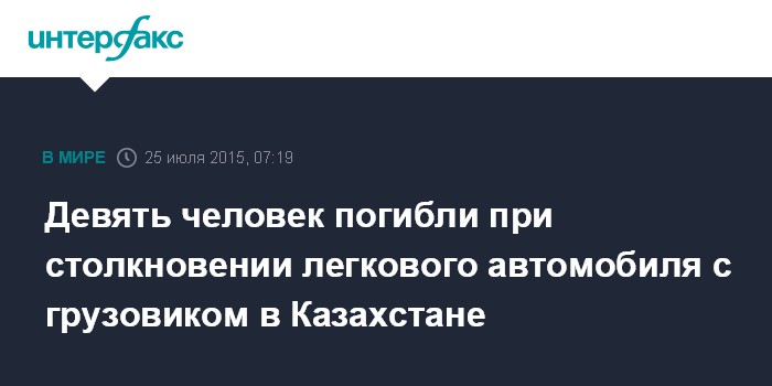 Москва. 25 июля. INTERFAX.RU - В Алматинской области Казахстана в результате столкновения легкового автомобиля с грузовиком погибли девять человек, трое госпитализированы, сообщила пресс-служба областной полиции.