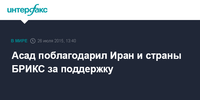 Москва. 26 июля. INTERFAX.RU - Помощь и поддержка со стороны стран БРИКС (Бразилия, Россия, Индия, Китай и ЮАР) помогает Сирии выстоять в борьбе против терроризма, заявил сирийский президент Башар Асад в телевыступлении в Дамаске.