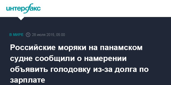 Москва. 28 июля. INTERFAX.RU - Приморские моряки, которые с мая находятся на судне Onyx Mahshahr, следующем из Ирана в Дубаи, намерены объявить голодовку из-за многомесячной задержки заработной платы.