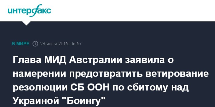 Москва. 28 июля. INTERFAX.RU - Министр иностранных дел Австралии Джулия Бишоп, прибывшая в Нью-Йорк, заявила, что ее задачей является добиться, чтобы на резолюцию по созданию трибунала по сбитому над Украиной год назад малайзийскому "Боингу" не было наложено вето.