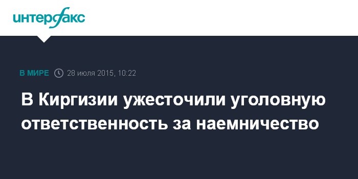Москва. 28 июля. INTERFAX.RU - Президент Киргизии Алмазбек Атамбаев подписал закон о внесении изменений в Уголовный кодекс страны, предусматривающих уголовное наказание за участие граждан в вооруженных конфликтах за границей, а также за прохождение террористической и экстремистской подготовки за рубежом.