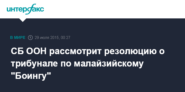 Москва. 29 июля. INTERFAX.RU - В Совете безопасности ООН в среду запланировано рассмотрение проекта резолюции по вопросу о создании международного трибунала для расследования причин крушения "Боинга-777" "Малайзийских авиалиний" в июле 2014 года над территорией Украины.