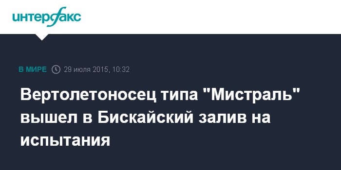 Москва. 29 июля. INTERFAX.RU - Десантный вертолетоносный корабль-док (ДВКД) "Севастополь" типа "Мистраль", построенный на верфях в Сен-Назере по заказу ВМФ России, вышел в Бискайский залив на четвертые по счету испытания в море, сообщил в среду "Интерфаксу" военно-дипломатический источник.
