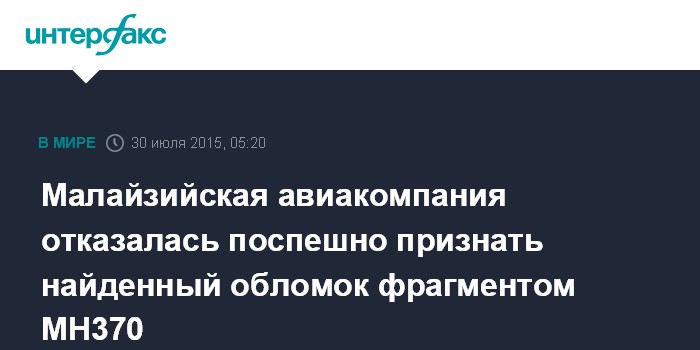 "Малайзийские авиалинии тесно работают совместно с соответствующими властями, что подтвердить (принадлежность обломка - ИФ). К настоящему моменту для авиакомпании было бы слишком преждевременно распространяться о флапероне", - говорится в распространенном компанией заявлении.