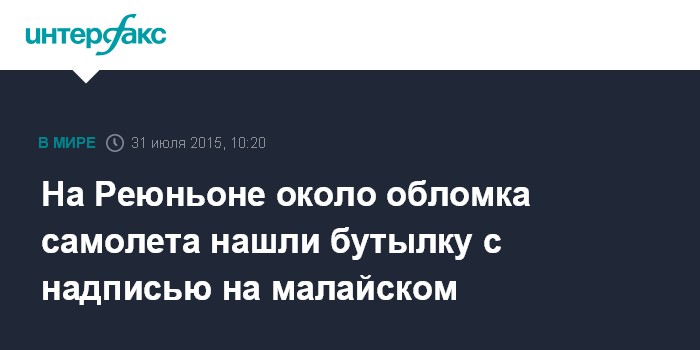 Москва. 31 июля. INTERFAX.RU - Бутылку с надписями на малайском языке обнаружили на острове Реюньон, где ранее был обнаружен обломок крыла самолета, передает в пятницу телеканал BFM TV.