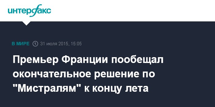 Москва. 31 июля. INTERFAX.RU - Премьер Франции Манюэль Вальс заявил в пятницу, что в конце лета ожидает принятия важных решений по проблеме вертолетоносцев "Мистраль", не поставленных Парижем российской стороне.