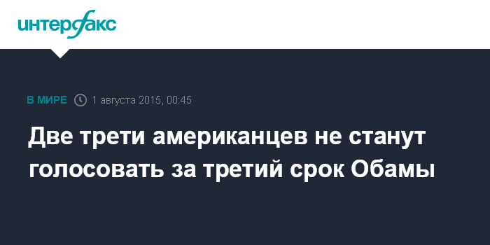 Москва. 1 августа. INTERFAX.RU - Американская социологическая компания Rasmussen Report провела исследование, согласно которому 63 процента жителей США не станут голосовать за третий срок президентства Барака Обамы, сообщает The Washington Times.