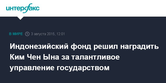 Москва. 3 августа. INTERFAX.RU - Северокорейский лидер Ким Чен Ын в сентябре получит от индонезийского образовательного фонда Sukarno награду за искусное управление государственными делами, сообщают в понедельник западные СМИ.