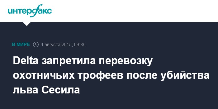Москва. 4 августа. INTERFAX.RU - Авиакомпания Delta внесла изменения в свои правила - согласно им, она больше не будет перевозить охотничьи трофеи, сообщает The Guardian.