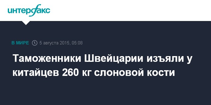 Москва. 5 августа. INTERFAX.RU - Швейцарские таможенники изъяли около 260 кг слоновой кости, найденных при проверке чемоданов граждан Китая. Как сообщает CNN, китайцы направлялись из танзанийского города Дар-эс-Салам в Пекин.
