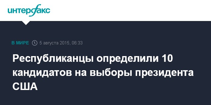 Москва. 5 августа. INTERFAX.RU - От Республиканской партии на пост президента США будут претендовать десять человек, которые в четверг проведут первые дебаты, сообщил американский телеканал Fox News.