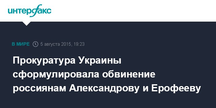 Москва. 5 августа. INTERFAX.RU - Задержанным в Луганской области гражданам РФ Александру Александрову и Евгению Ерофееву будет предъявлено обвинение в подготовке и развязывании вооруженного конфликта (войны) на территории Украины, заявляют в украинской Генпрокуратуре.