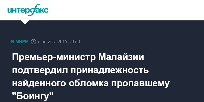 Москва. 5 августа. INTERFAX.RU - Обломок крыла самолета, найденный на острове Реюнион, принадлежит пропавшему "Боингу" Malaysia Airlines MH370, сообщил премьер-министр Малайзии Наджиба Разака. Об этом пишет "Би-би-си".