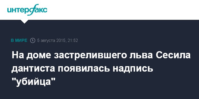 Москва. 5 августа. INTERFAX.RU - Неизвестные расписали граффити дом зубного врача Уолтера Палмера в штате Флорида (США), убившего в Зимбабве льва Сесила, сообщают в среду западные СМИ.
