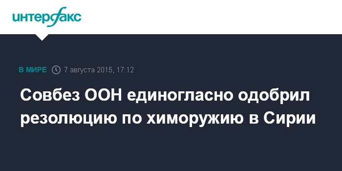 Москва. 7 августа. INTERFAX.RU - Члены СБ ООН в пятницу одобрили резолюцию о создании механизма расследования и выявления виновных в применении химического оружия в Сирии.