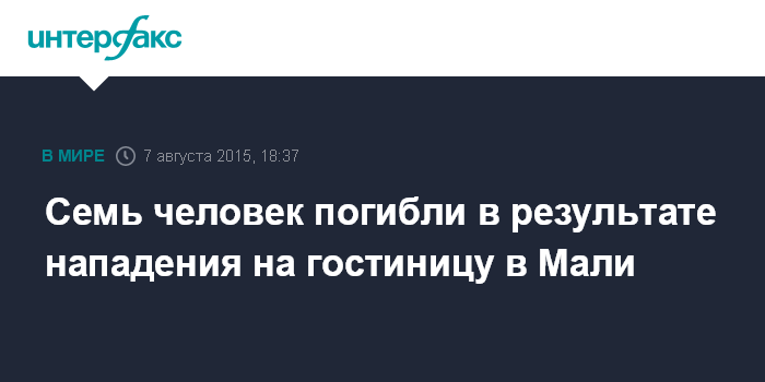 Москва. 7 августа. INTERFAX.RU - Группа вооруженных людей в Мали совершила нападение на гостиницу в городе Севар, в результате чего погибли семь человек, сообщают в пятницу французские СМИ со ссылкой на очевидцев.