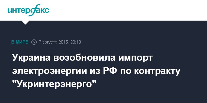 Москва. 7 августа. INTERFAX.RU - Украина возобновила импорт электроэнергии из РФ по контракту между "Укринтерэнерго" и "Интер РАО", сообщили в пятницу агентству "Интерфакс" в украинской Минэнергоугля.