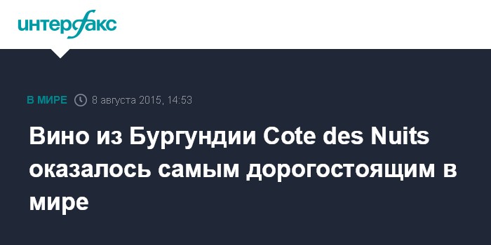 Москва. 8 августа. INTERFAX.RU - Вино из французского региона Бургундия Richebourg Grand Cru, en Cote des Nuits по состоянию на август является самым дорогостоящим в мире, сообщают в субботу парижские СМИ со ссылкой на исследование, проведенное специализированным сайтом Wine Searcher.