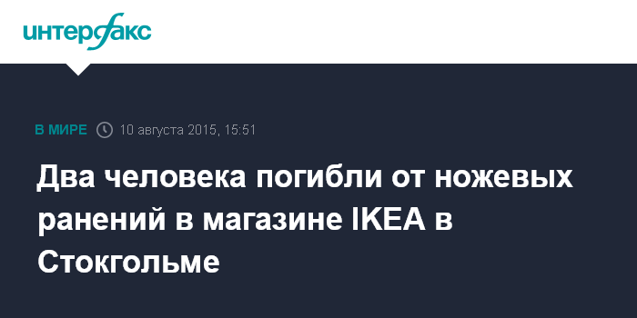 Москва. 10 августа. INTERFAX.RU - Два человека погибли в понедельник от ножевых ранений, полученных в результате нападения в магазине IKEA недалеко от Стокгольма, сообщает шведское интернет-издание The Local.